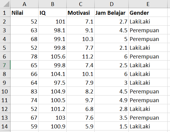 Dari keempat variabel bebas di atas hanya variabel Motivasi saja yang tidak signifikan mempengaruhi Nilai siswa, sedangkan tiga variabel lainnya berpengaruh signifikan. Variabel Jam belajar berpengaruh positif terhadap Nilai siswa, dimana setiap penambahan 1 jam belajar maka akan menaikkan nilai sebesar 2,56 poin dengan asumsi variabel lainnya konstan. Variabel IQ juga demikian, semakin tinggi tingkat IQ seseorang maka nilai siswa cenderung lebih tinggi.