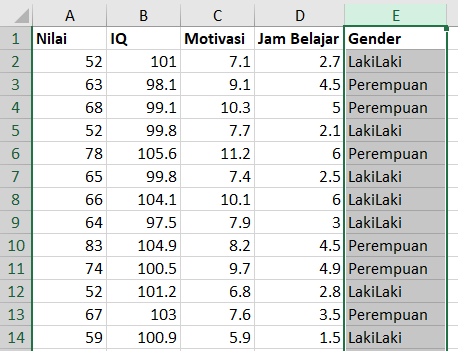 - Selanjutnya adalah mengganti data “Perempuan” menjadi angka 0.