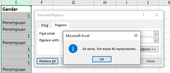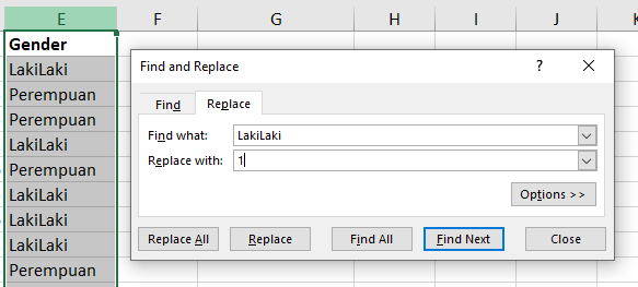 - Isi kotak “Find what” dengan mengetikkan “LakiLaki”, kemudian isi bagian “Replace with” dengan angka 1.