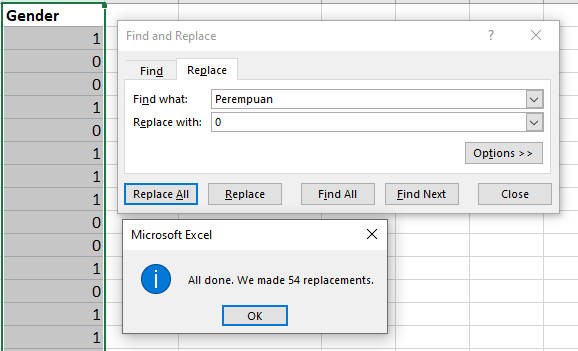 - Pada gambar di bawah ini menunjukkan bahwa data “Perempuan” yang berhasil diubah menjadi angka 0 adalah sebanyak 54.