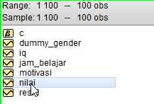 - Klik variabel secara berurutan sesuai model yang telah Anda buat dimulai dari variabel dependen (terikat) dulu sampai variabel terakhir dalam urutan model. Dalam contoh ini yang merupakan variabel dependen adalah variabel “nilai”.