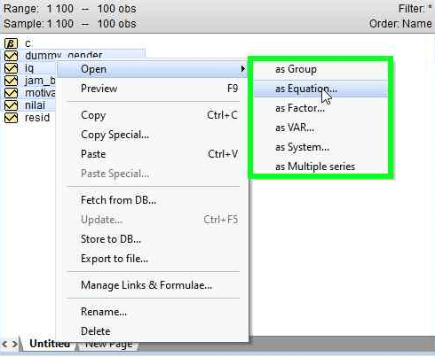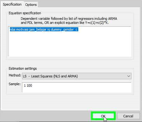 - Kotak dialog “Equation” kurang lebih seperti gambar di bawah ini. Pada bagian berwarna biru adalah rumus model regresi kita. Secara default c (kosntanta/intersep) berada di bagian paling akhir. Bila Anda tidak terbiasa, Anda bisa memindahkan secara manual setelah variabel dependen.