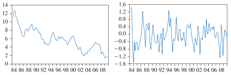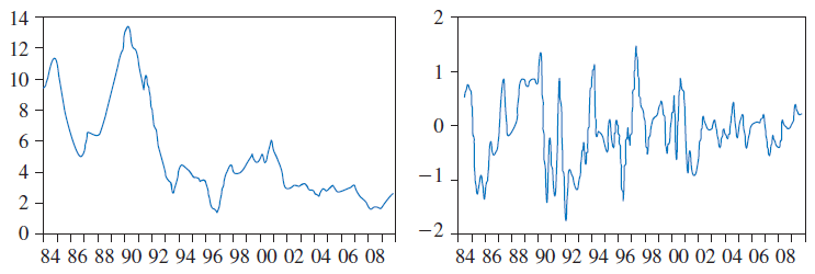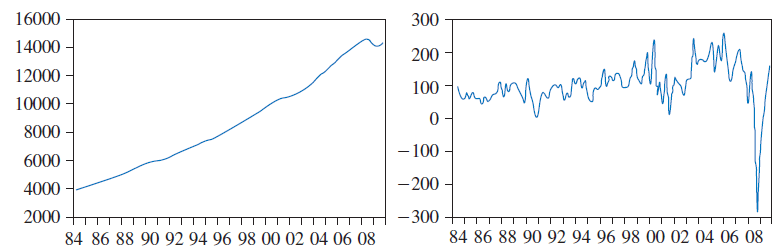 Rangkaian waktu dari perubahan di gambar sisi kanan menampilkan perilaku yang dapat digambarkan sebagai naik turun tidak teratur, atau fluktuasi. Perhatikan bahwa meskipun perubahan dalam tingkat inflasi dan dua suku bunga tampaknya berfluktuasi di sekitar nilai konstan, perubahan dalam variabel PDB tampaknya berfluktuasi di sekitar kenaikan tren, sampai terjadi krisis keuangan global. Nah dari data time series di atas manakah yang mewakili variabel stasioner dan mana yang variabel nonstasioner?.