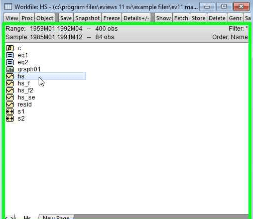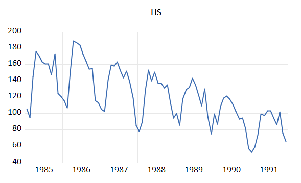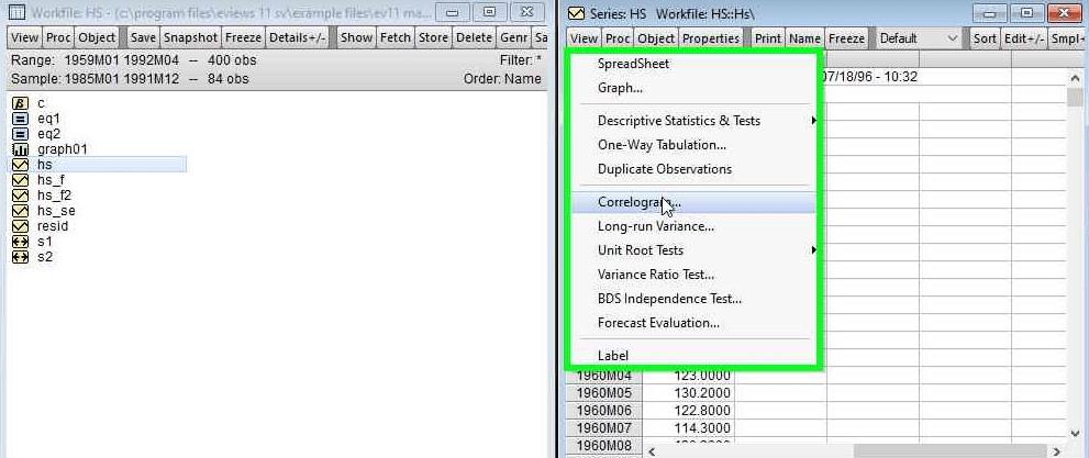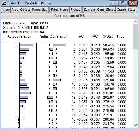 Kali ini saya menggunakan contoh data yang bisa diunduh DI SINI. Data yang saya gunakan adalah data household spending (HS) bulanan dari tahun 1959 sampai tahun 1992. Hal pertama yang akan kita lakukan adalah melihat grafik dari data ini. Sepintas grafik data time series ini terlihat tidak stasioner, ada perubahan yang mengarah pada trend yang menurun. Secara visual kita bisa memanfaatkan tabel collerogram yang disediakan Eviews. Kita akan membandingkan antara collerogram pada level, 1st difference, dan 2nd difference. Apakah data “HS” ini sudah stasioner pada level ataukah di tingkat difference?.