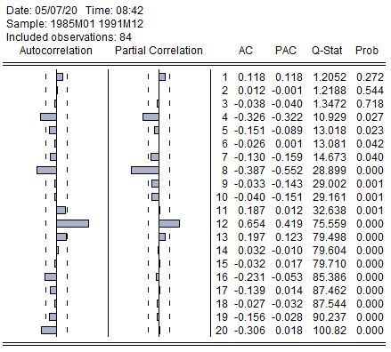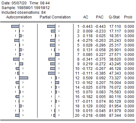 Output correlogram pada level ini mengindikasikan data tidak stasioner. Kita bisa membandingkan dengan data pada tingkat 1st difference yang hasilnya seperti gambar di bawah ini. Prosedur memunculkan correlogram pada 1st difference ini sama saja dengan prosedur pada level, hanya saja tinggal pilih tingkat perubahan (difference) yang diinginkan.