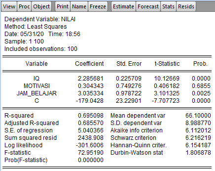 Nilai = a + b1 IQ + b2 Motivasi + b3 JamBelajar + e