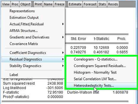 - Arahkan kursor mouse Anda ke pilihan tes “Residual Diagnostics” kemudian arahkan mouse ke kanan dan pilih “Heteroskedasticity Tests…”.