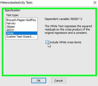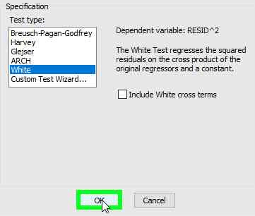 - Pilih Test type di kotak pilihan pada “White”, biarkan centang pada “Include White cross terms” untuk melakukan uji White secara lengkap.