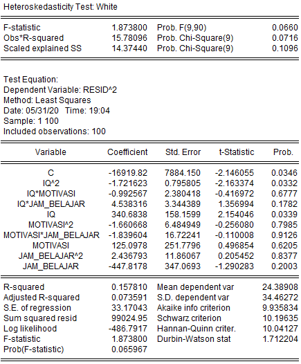 - Hasil uji white tersebut memperlihatkan nilai p-value sebesar 0,0716 atau lebih besar dari α (0,05). Dengan demikian kita tidak menolak Ho yang menyatakan bahwa varians adalah sama, atau tidak ada gejala heteroskedastisitas.
