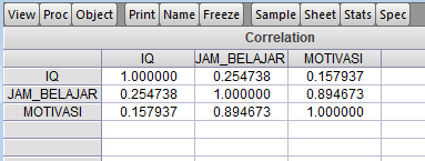 - Tampilan matrik korelasi hasil penghitungan Eviews seperti gambar di bawah ini.