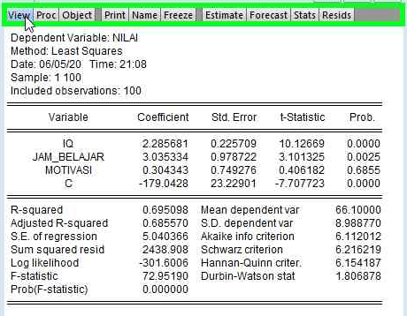 - Buka output regresi Anda, kemudian pilih menu “View”