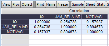 Hasil di atas membuktikan bahwa tidak ada masalah multikolinieritas antara variabel IQ dan Motivasi serta variebel IQ dan Jam Belajar. Namun pada varaiabel Motivasi dan Jam belajar nilai korelasinya tinggi yaitu 0,89 sehingga diindikasikan adanya multikolinieritas.