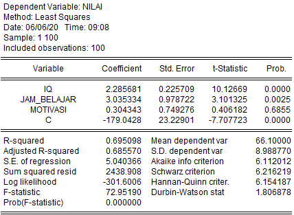 Hasil tes diatas adalah luaran tes linieritas menggunakan Ramsey RESET dengan varian tes gabungan yaitu model kotak dan persegi. Hasil tes menunjukan bahwa nilai probabilitas lebih besar dari α = 0,05 yang artinya model nonlinier tidak lebih baik dari model linier. Dengan demikian asumsi linieritas pada model regresi ini terpenuhi.