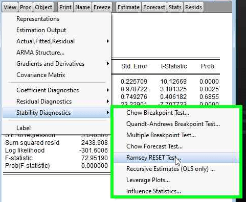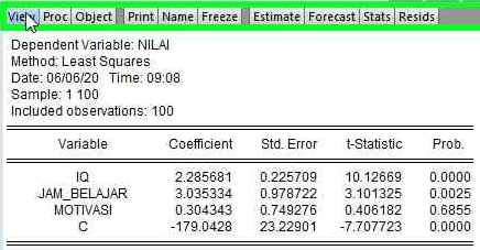 - Setelah keluar output regresi mulailah tes Ramsey RESET ini dengan memilih menu “View”.