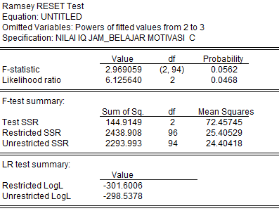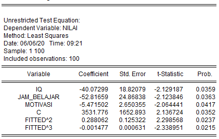 - Karena tadi saya memilih dua term fit maka ada dua variabel bebas tambahan (FITTED^2 dan FITTED^3) sebagai kontrolnya.