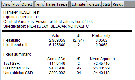 Salah satu Uji lineritas yang paling populer adalah uji Ramsey Regression Equation Specification Error Test atau sering disingkat dengan uji Ramsey RESET. Uji ini dikembangkan oleh James B. Ramsey sebagai bagian dari diraihnya gelar Ph.D. di University of Wisconsin. Uji Ramsey RESET adalah tes spesifikasi umum untuk model regresi linier. Uji ini dilakukan untuk membuktikan apakah kombinasi non-linear dari nilai-nilai yang dipasang membantu menjelaskan variabel respons. Jika kombinasi non-linear dari variabel bebas memiliki kekuatan dalam menjelaskan variabel terikat, mungkin model tersebut lebih baik didekati dengan model polinomial atau fungsi non-linear lainnya. Prosedur uji Ramsey RESET di Eviews bisa dilakukan melalui langkah-langkah sebagai berikut: