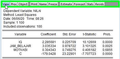 - Buka output model regresi Anda, lalu pilih menu “View”