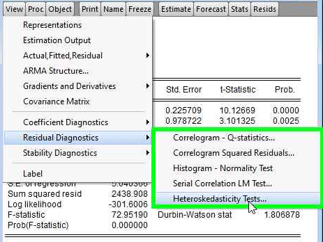 - Arahkan mouse ke bawah menuju menu “Residual Diagnostics” lalu arahkan ke kanan dan pilih “Heteroskedasticity Tests…”.