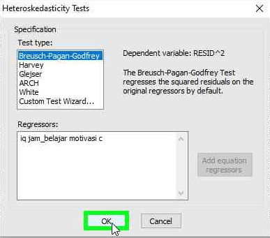 - Pastikan Anda memilih ‘Breusch-Pagan-Godfrey” (tes yang aktif berwarna biru). Setelah itu akhiri dengan klik “OK”.