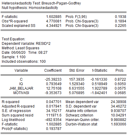 Uji ini dilakukan untuk membuktikan apakah varians kesalahan dari regresi tergantung pada nilai-nilai variabel independen. Ingat bahwa model regresi terbaik mengasumsikan bahwa varians residual yang dihasilkan adalah konstan, ini berarti bahwa berapapun nilai variabel independennya variasi residual tetap konstan. Ini artinya variabel independen tidak mempunyai pengaruh signifikan terhadap nilai kuadrat residualnya.