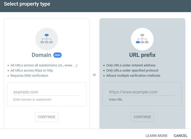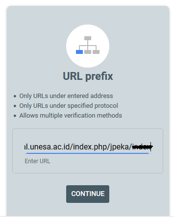 - Pilih tipe Properti “URL prefix”. Kemudian masukkan url home website Anda.