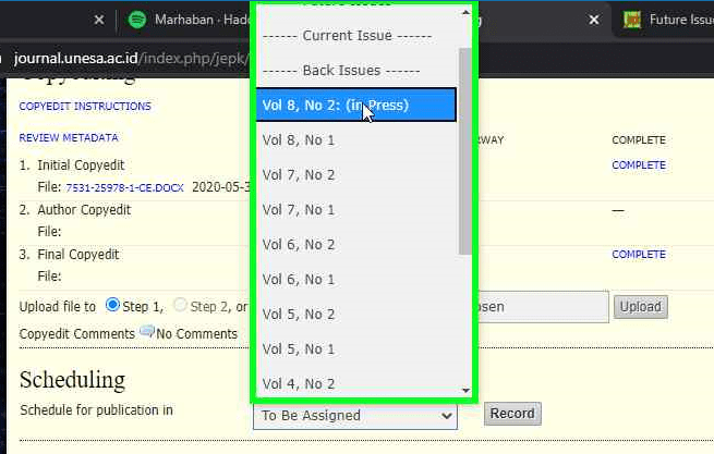 - Pilih nomor isu dimana artikel tersebut akan diterbitkan. Kali ini saya memilih Vol 8 no 2 (in pres).