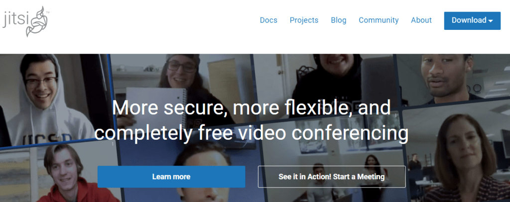 - Silakan menuju laman Jitsi di url https://jitsi.org/ kemudian pilih “See it in Action! Start a Meeting”.