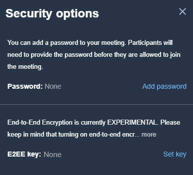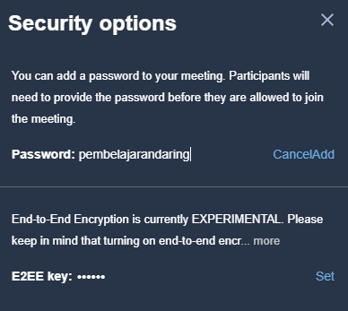 - Ada baiknya kita memberi password untuk ruang virtual kita untuk menghindari partisipan yang tidak berkepentingan masuk ke ruang virtual kita. Silakan klik tanda/tombol perisai berwarna oranye atau “Security options” di pojok kiri bawah layar seperti gambar di bawah ini.
