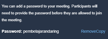 - Link url yang dihasilkan adalah sebagai berikut https://meet.jit.si/Kelas7cMatematika tanpa disertai password karena password tidak tersimpan dan hanya bisa disetting ketika ruang virtual sedang digunakan. Jadi password ini bersifat tidak tetap, sehingga diperlukan kesepakatan atau informasi terlebih dulu kepada partisipan, juga sangat penting untuk membuat nama ruang virtual yang unik disertai penyebaran yang terbatas.