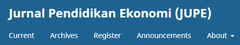 - Langkah pertama adalah mengunjungi laman jurnal yang kita tuju misalnya dalam contoh ini adalah Jurnal Pendidikan Ekonomi (JUPE) yang beralamat di url https://ejournal.unesa.ac.id/index.php/jupe/ bila menu atau tombol “Register” belum tersedia di laman tersebut biasanya journal manager lupa atau belum mengaktifkannya, Anda bisa langsung ke halaman hostingnya, misalnya di contoh ini host jurnal tersebut ada di alamat https://ejournal.unesa.ac.id/