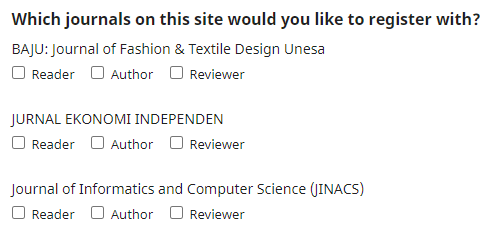 - Bila Anda mendaftar di laman hosting maka Anda akan mendapatkan pilihan mendaftar di jurnal mana saja di site tersebut. Anda bisa memilih semua jurnal atau beberapa jurnal yang terkait dengan bidang Anda saja. Bila Anda melakukan registrasi di salah satu laman jurnal, maka Anda hanya akan teregister di jurnal tersebut dan bisa ngeditnya lagi di lain kesempatan untuk jurnal lain di host tersebut.