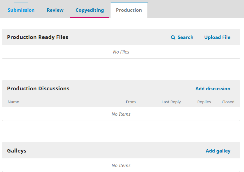- Cari bagian “Production” di bagian submission artikel tesebut. Pada bagian ini klik “Upload File” untuk mengunggah file galley.