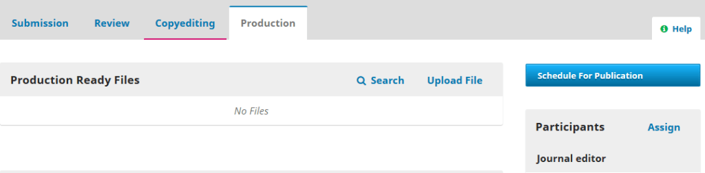 - Silakan buka submission artikel yang akan diterbitkan, kemudian buka bagian “Production”. Klik “Schedule For Publication” untuk mulai menjadwalkan penerbitan artikel tersebut.