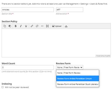 Ketika kita sudah mengaktifkan review form ini di bagian review ini tidak otomatis langsung bisa digunakan. Kita harus melakukan setting di section publikasi yang disediakan untuk penulis.