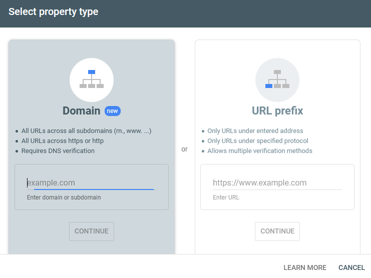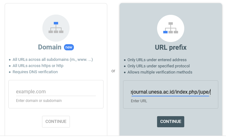 - Selanjutnya pilih jenis property kita, untuk laman OJS jurnal ilmiah sebaiknya pilih “URL prefix”.