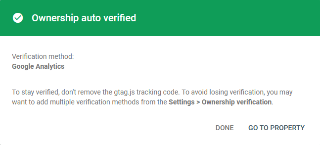 - Karena property Google Analytics kita sudah aktif, maka verifikasi property Google Webmaster kita secara otomatis akan langsung terverifikasi.