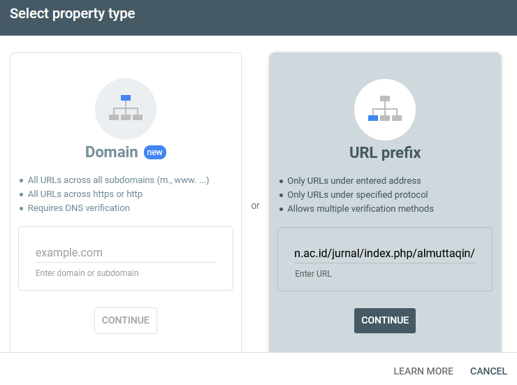 - Pilih jenis property “URL prefix” lalu masukkan URL beranda (home) laman jurnal Anda seperti gambar di bawah ini, kemudian klik tombol “CONTINUE”.