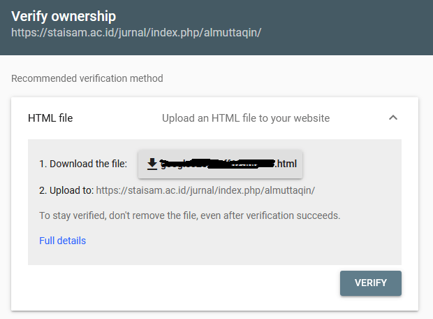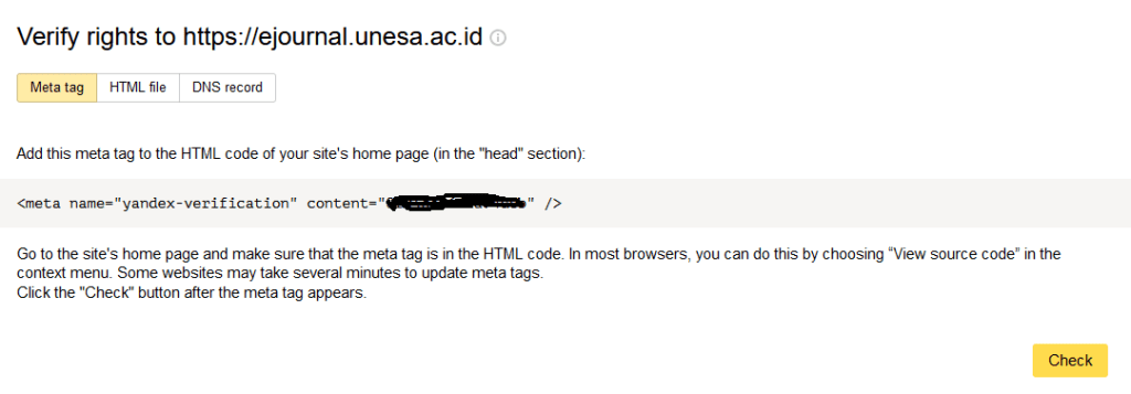 - Meta tag verifikasi sudah siap untuk dimasukkan di laman OJS 3.