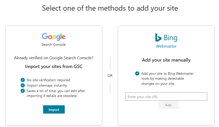 - Pilih metode “Import”, karena metode ini sangat simpel dan menggunakan Google Webmaster yang telah kita buat di atas. Jadi tidak dua kali kerja.