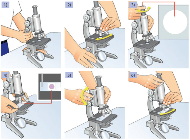 1) Ambillah mikroskop dari kotak penyimpanannya. Tangan kanan memegang bagian lengan mikroskop dan tangan kiri memegang alas mikroskop. Kemudian, mikroskop diletakkan di tempat yang datar, kering, dan memiliki cahaya yang cukup.