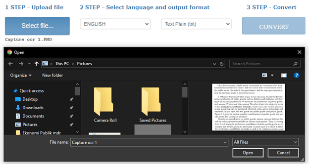 Kali ini saya akan menggunakan aplikasi OCR online yang tentunya lebih up to date dari pada OCR bawaan scanner saya. Saya akan menggunakan jasa onlineocr.net, walaupun gratisan namun sangat handal. Cara ini saya anggap adalah cara paling praktis untuk mengubah gambar menjadi teks online. Ada tiga tahap yang harus kita lakukan, yaitu: upload file gambar, memilih bahasa dalam teks dan format teks luaranya, kemudian tinggal klik convert.